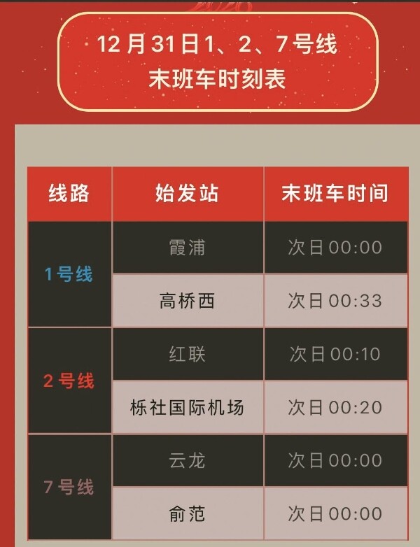 为保障跨年夜及元旦假期市民乘客出行需求,2025年12月31日至2026年1月3日期间执行特殊日时刻表,全线网延长运营服务时间,陪伴市民轻松跨年、安心出行。根据方案安排,2025年12月31日跨年夜当