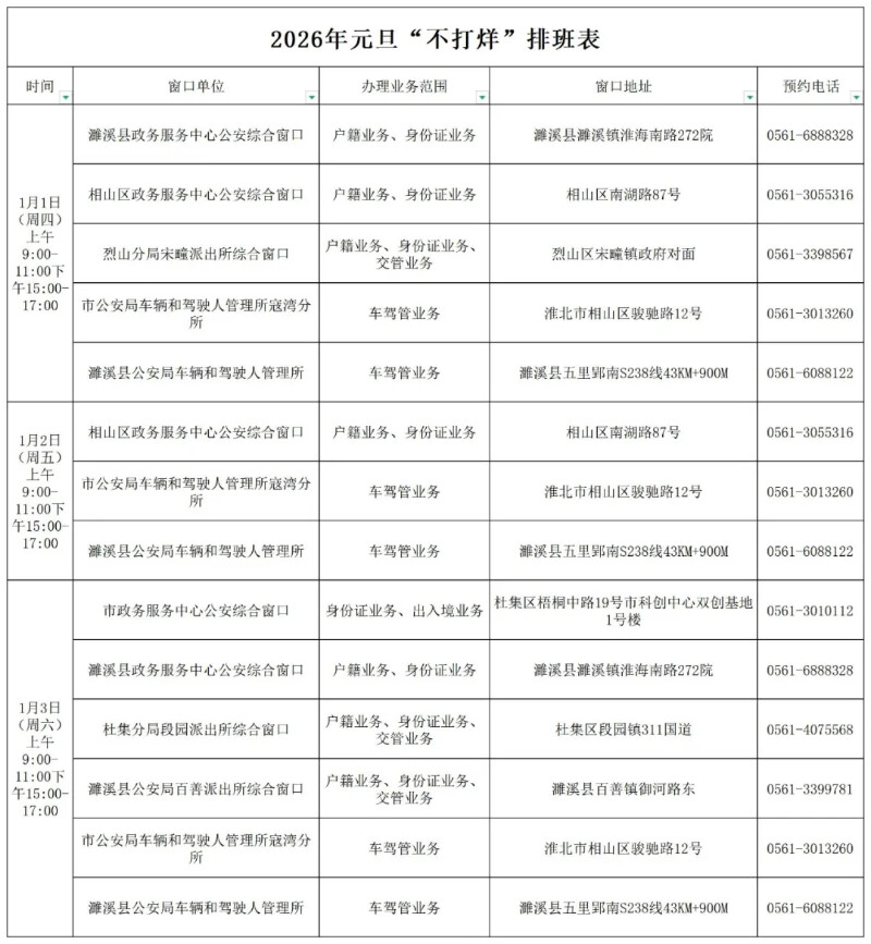 元旦假期要到啦!公安服务窗口放假吗?淮北市公安局为方便市民朋友们和企业办事,公安政务窗口提供,元旦假期“不打烊”暖心服务。户政业务初次申领、换领、补领身份证等业务;户口迁移、落户、信息变更等业务。交管