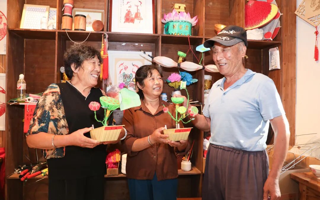 国庆佳节,走进非遗工作室,四五位手艺人分坐在不同区域,埋头扎灯架、裱糊灯面、绘装饰、包装,精心赶制一批精美的兔子灯、花灯和宫灯。抬头望去,造型各异、大小不一的手工花灯错落悬挂于屋顶,鱼龙灯、瓶灯、蛤蟆灯琳琅满目,美不胜收……