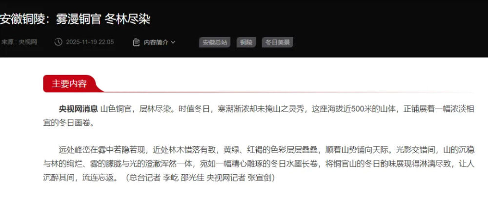 11月19日,央视网以《雾漫铜官 冬林尽染》为题,报道了铜官区铜官山独特生态景观,生动展现皖风徽韵魅力。报道显示,海拔近500米的铜官山虽值寒潮渐浓,仍生机勃发,远处峰峦隐于云雾,近处黄绿、红褐色林木沿山势绵延,勾勒出灵动秀美的冬日生态画卷。