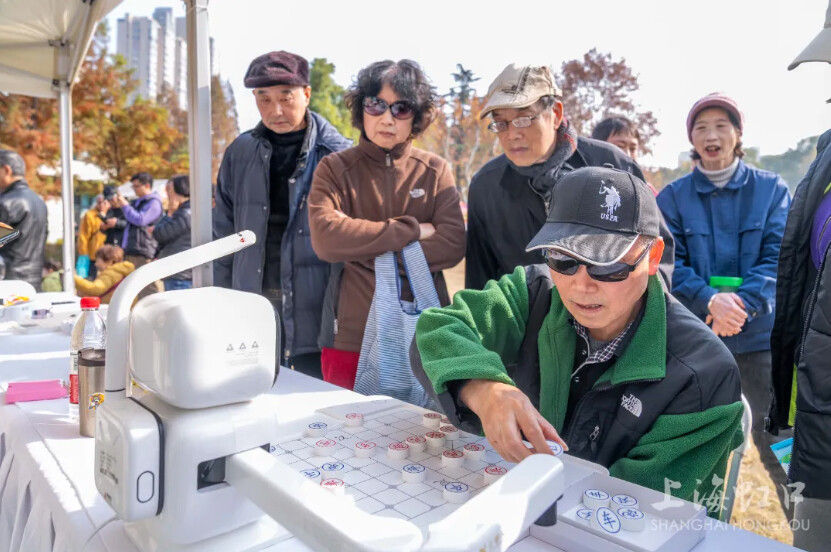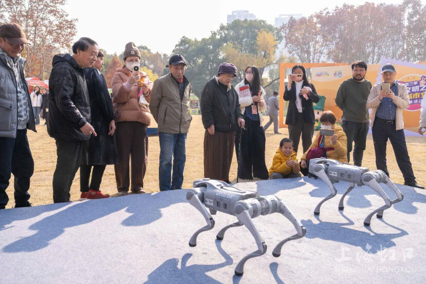 虹口区社区学院带来的机器狗与下棋机器人人气爆棚。“很好玩!机器人也很聪明,能感受到为了适合大众体验设置了初级版本。”刚体验完下棋机器人的市民费先生笑着告诉记者,“我们就住在和平公园附近,昨天看到搭建的帐篷就特别期待,今天第一时间入场体验!”