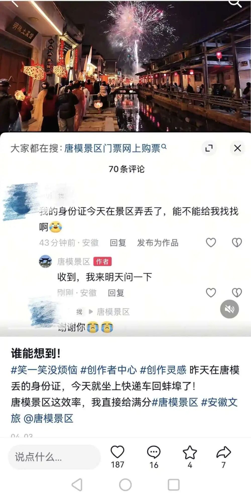 近日,一场围绕身份证的暖心接力在徽州区潜口镇唐模景区上演。游客卢女士游玩时不慎遗失证件,通过抖音私信焦急求助,景区工作人员第一时间响应安抚、细致核查信息;票房工作人员整理时发现遗失身份证,脱口而出的一句话最能代表景区态度:“得赶紧联系上客人!”迅速核对后,当即快递寄还。失而复得的卢女士惊喜感动,在社交平台主动为景区暖心服务点赞致谢。