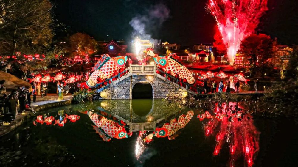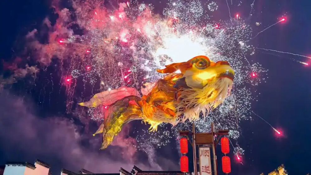 当夜幕降临,鱼灯在古巷中蜿蜒穿行,绕永兴湖盘旋,在广场上摇曳生姿。灯笼的暖光洒满青石板路,烟火在夜空绽放,马头墙上光影流转。那一刻你终于明白:这不是一场表演,而是一整个古村在用最温柔的方式,把徽州的光影捧到你面前。