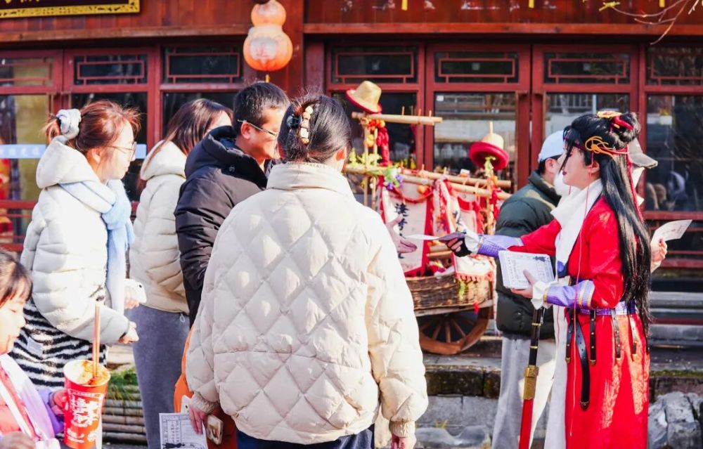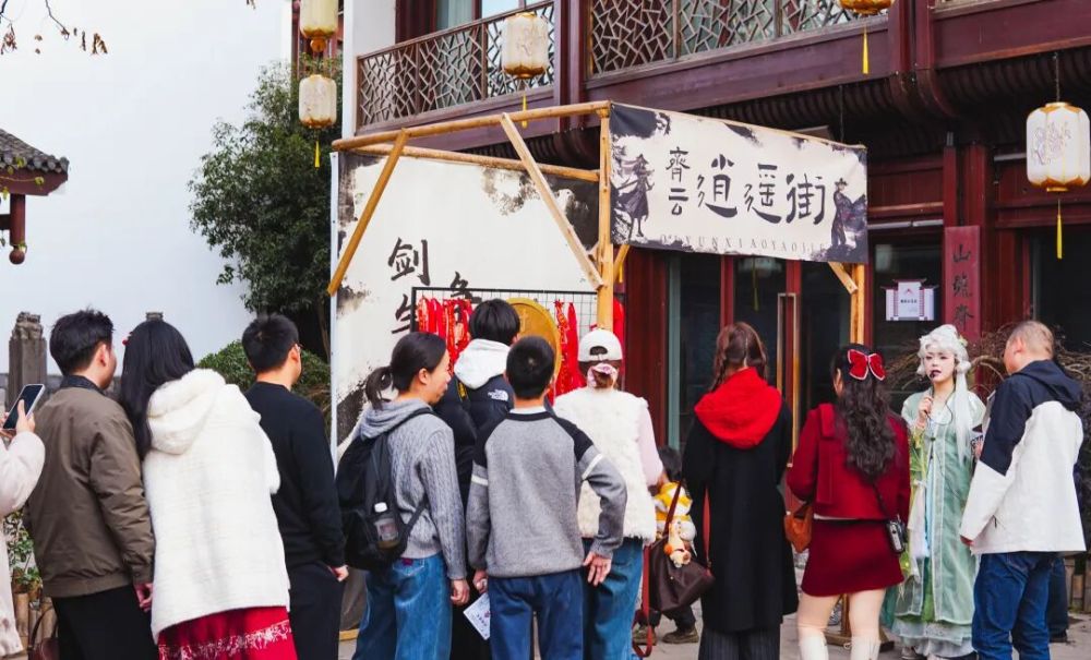 山下的江湖世界同样从上午就开启,无论是赢取逍遥通宝的互动游戏,或是“舞狮醒春”等互动演艺,游山玩水的度假氛围直线UP。