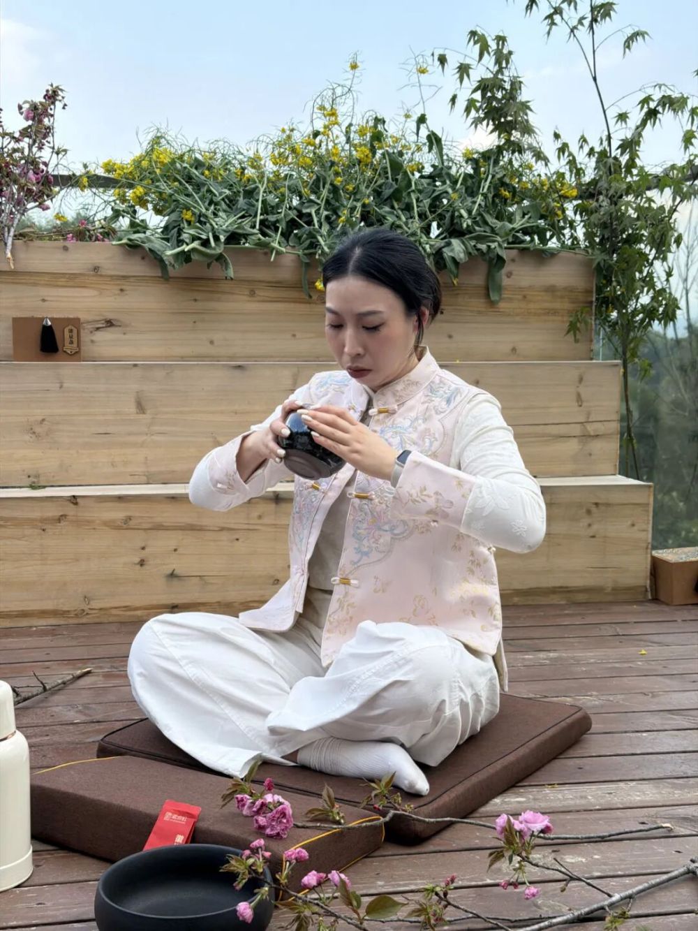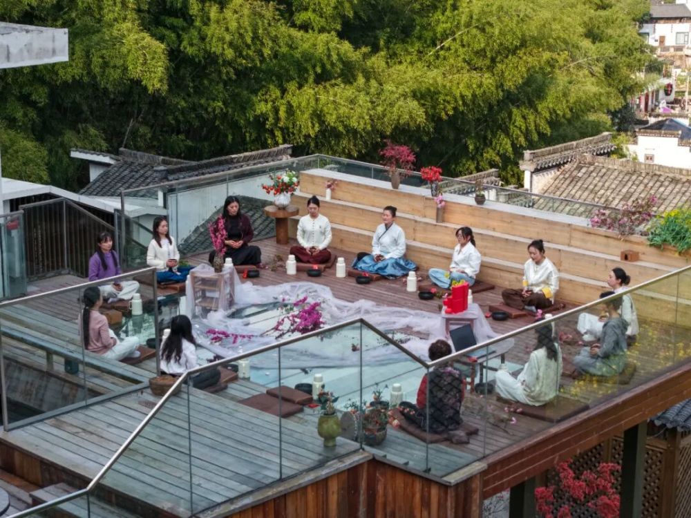 十二三人围坐,舒展身体,闭目闻香。取一叶徽州红茶,落入能量建盏,热水注入的瞬间,茶香与花香在春风里交融。茶烟袅袅间,焦虑被一点点化解,心也跟着静了下来。
