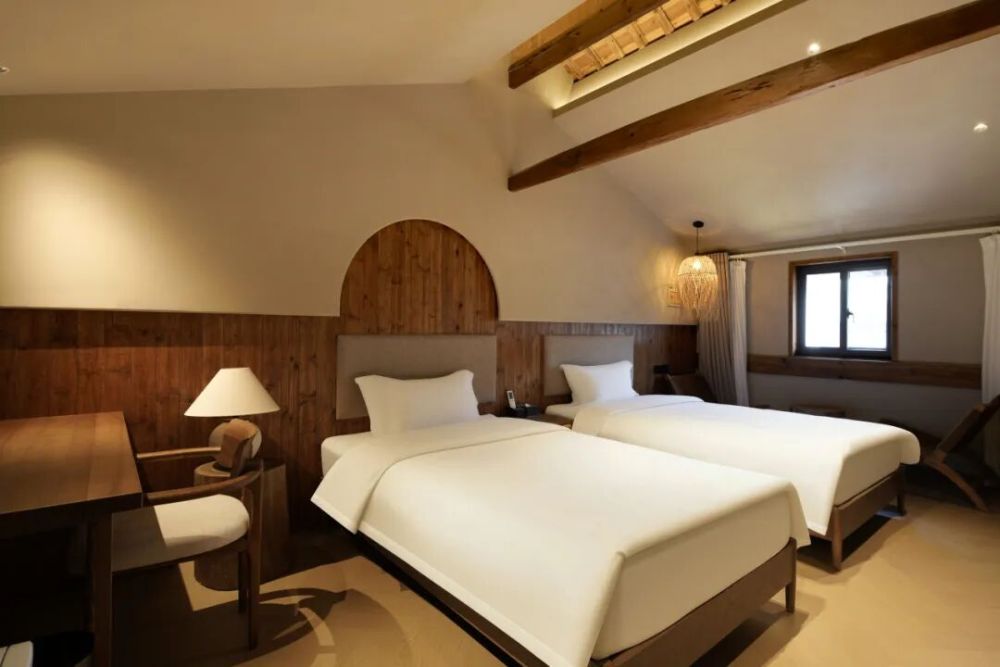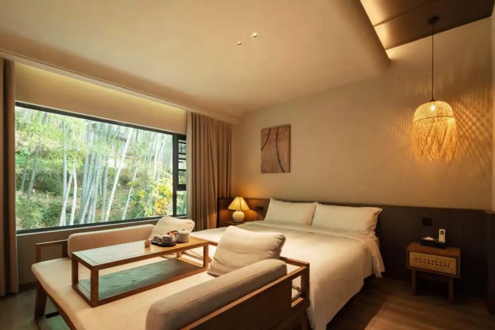 竹月公馆共有8间客房,每一间都精心布置。落地窗把竹海山色框进屋里,躺在床上看竹影摇曳、云卷云舒。被竹林360°包围的安静,本身就是最好的疗愈。