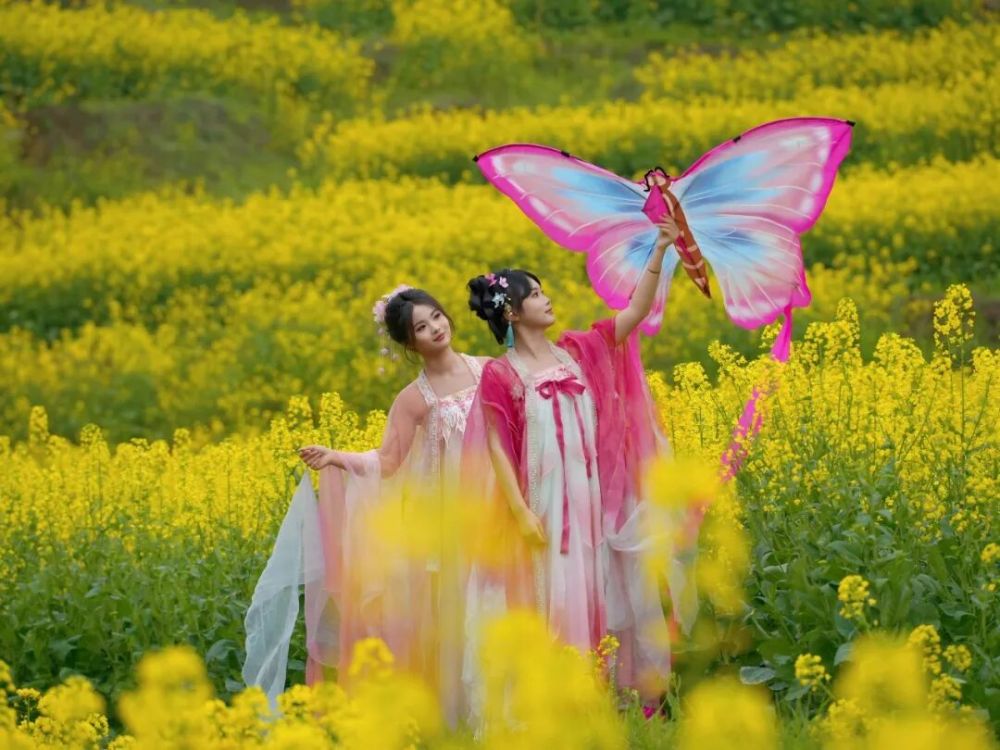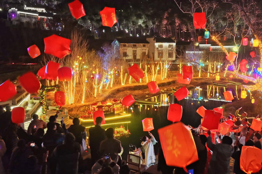 当夜幕降临,“天上金灯会”点亮整座山谷。千盏金灯汇成星河,鱼龙巡游穿行花海,《灵山恋》的歌声在春风里飘荡。牵着孩子的手,一起走进这场流动的梦境。