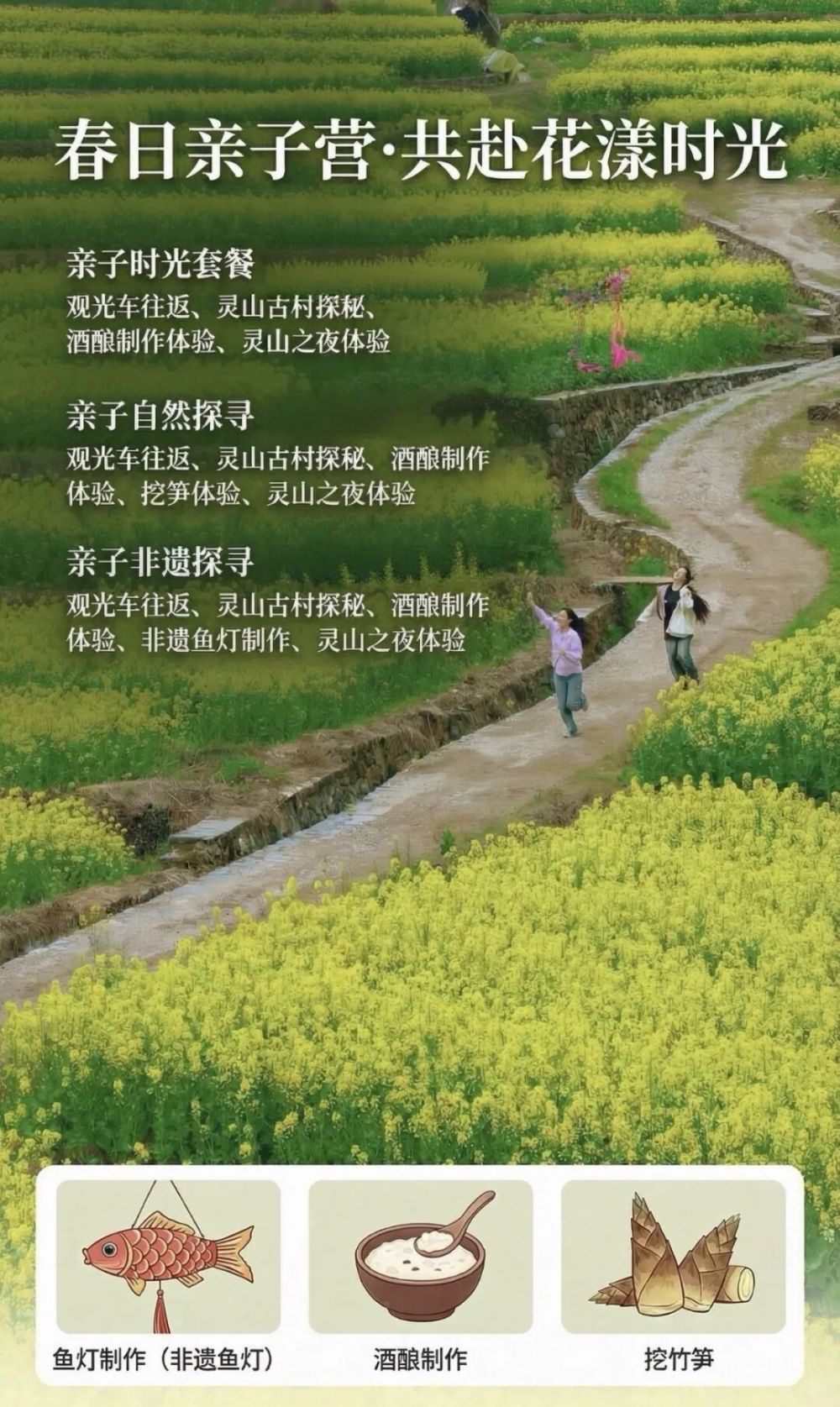 包含:观光车往返、灵山古村探秘、酒酿制作体验、非遗鱼灯制作、灵山之夜体验