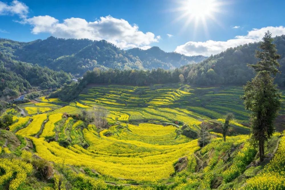 春风漫过徽州山野,大灵山旅游度假区千亩油菜花迎来全盛花期,铺就漫山遍野的金色海洋,春日限定「金」喜如期而至。