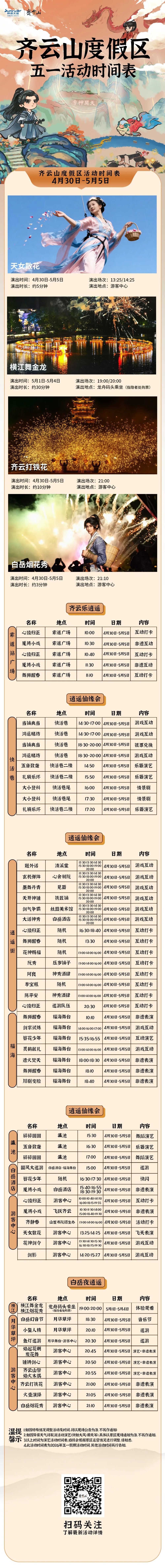 一、景区运营时间调整为上午7:00至下午17:30二、月华索道运营时间调整为上午7:00至下午17:30三、横江山水竹筏运营时间调整为上午8:30至下午17:00四、齐云逍遥街运营时间调整为上午7:00至晚上22:00五、自由家营地运营时间调整为上午8:00至下午17:00六、下山景交车运营时间调整为上午9:00至下午17:20五一假日期间(4月30日至5月5日),齐云山度假区日游夜游百场活动升级上新,“天女散花”空中演艺首秀,“齐云打铁花“、“白岳烟花秀”等大型夜游活动欢乐不停。同时,持有齐云山度假区任一业态或住宿产品消费凭证的游客(包含齐云山景区门票、月华索道交通票、横江山水竹筏票、自由家营地门票、齐云山白岳度假酒店、齐云山月华度假酒店、自由家树屋世界),均可享齐云逍遥街48小时免票游玩权益(以业态消费或住宿产品的核销时间为准),性价比更高!五一假期活动将按照以下时间表执行,请游客按需保存: