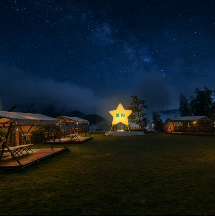 围着篝火啃着串,抬头就是银河,这种快乐,城市给不了。重点来啦!我们在营地里竖起一颗巨型星星灯——