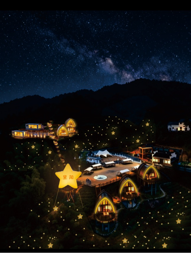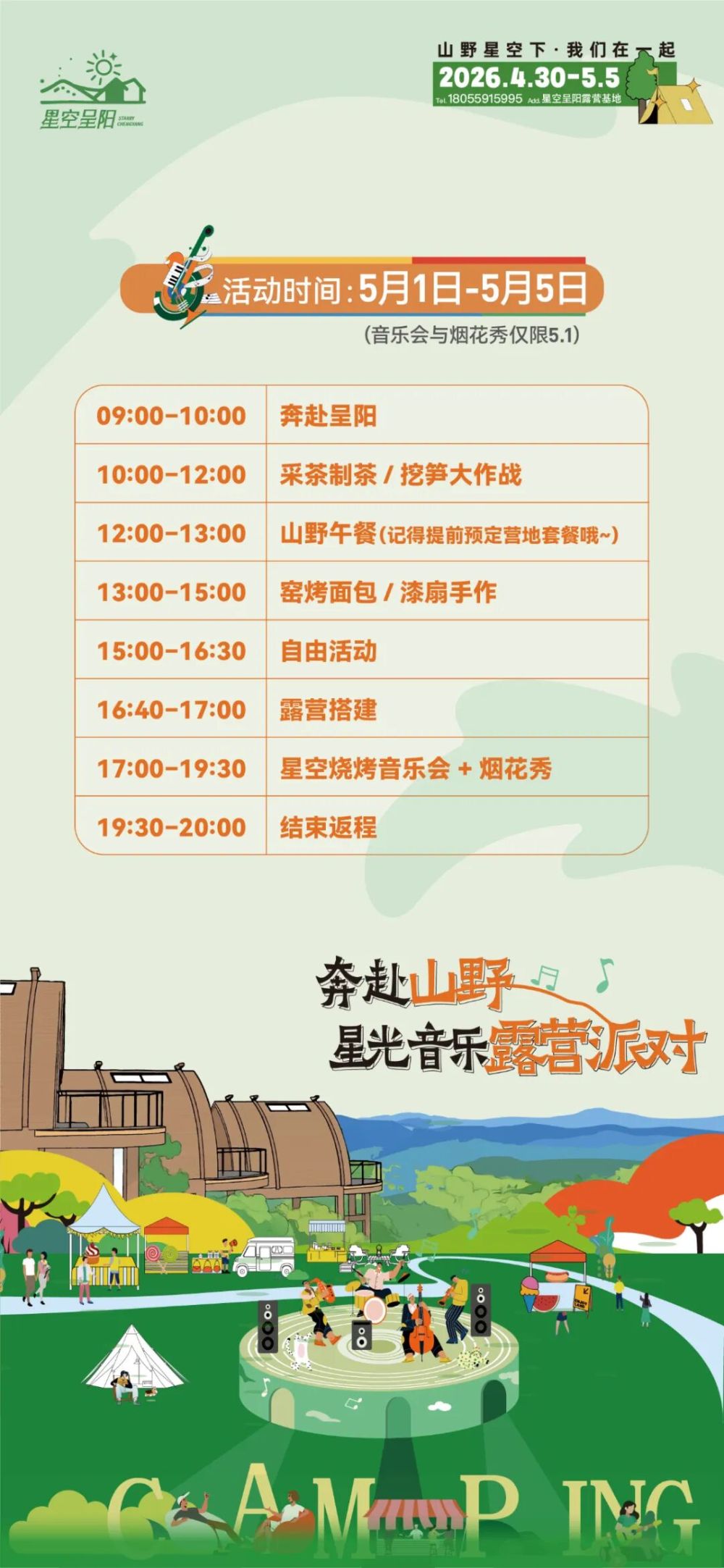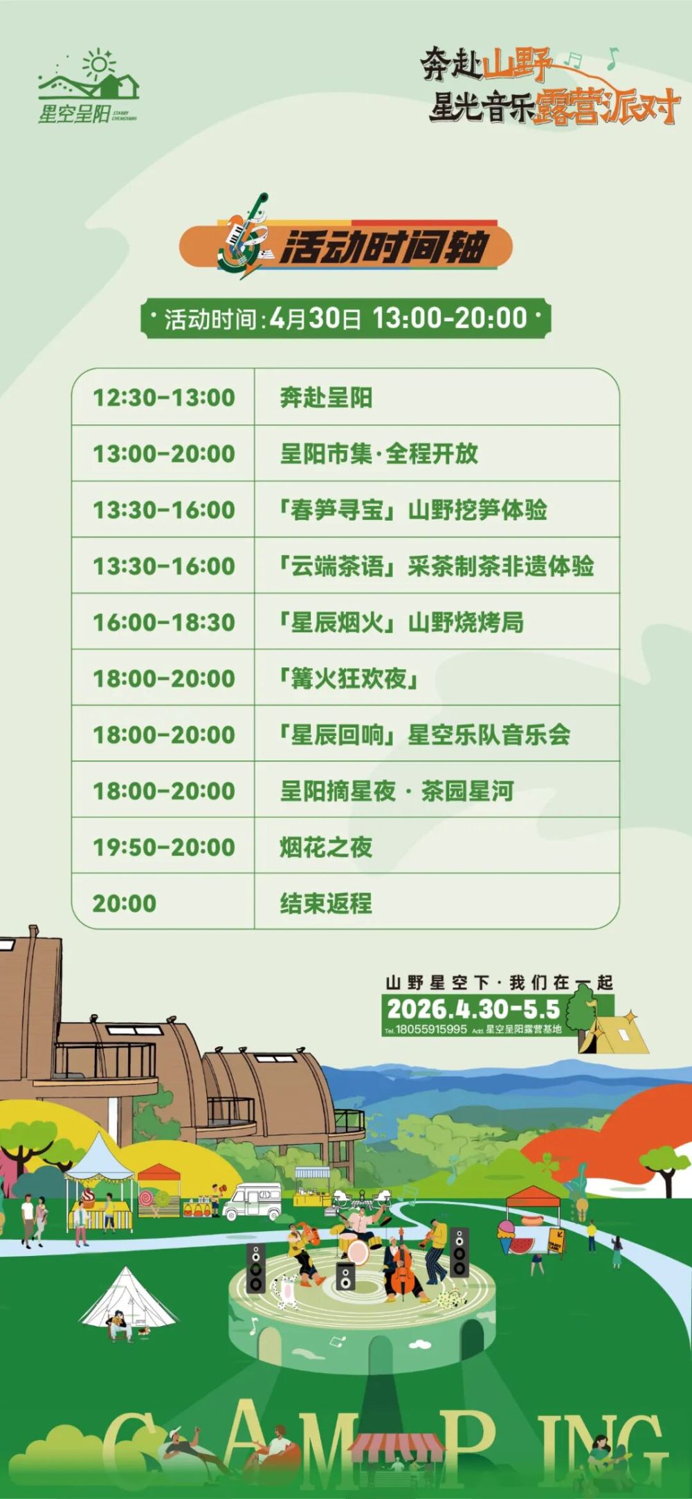 这是呈阳,海拔666米,一次三重星光的叙事——第一重,是天上星。夜幕沉降,银河在头顶铺开,还有偶尔划过的流星。第二重,是山中星。营地中央,一颗巨型星星灯在发光,暖金色的光芒漫过山谷;茶园深处,上百颗小星星散落在茶树垄间,忽明忽暗,碎成一条蜿蜒的地上银河。第三重,是你眼里的星。当夜色浸透山野,音乐响起,篝火跳动——你抬起头,光落进瞳孔的那一瞬间,星星不在天上,在你眼里。这个五一,三重星光同框,许你无限耀眼!
