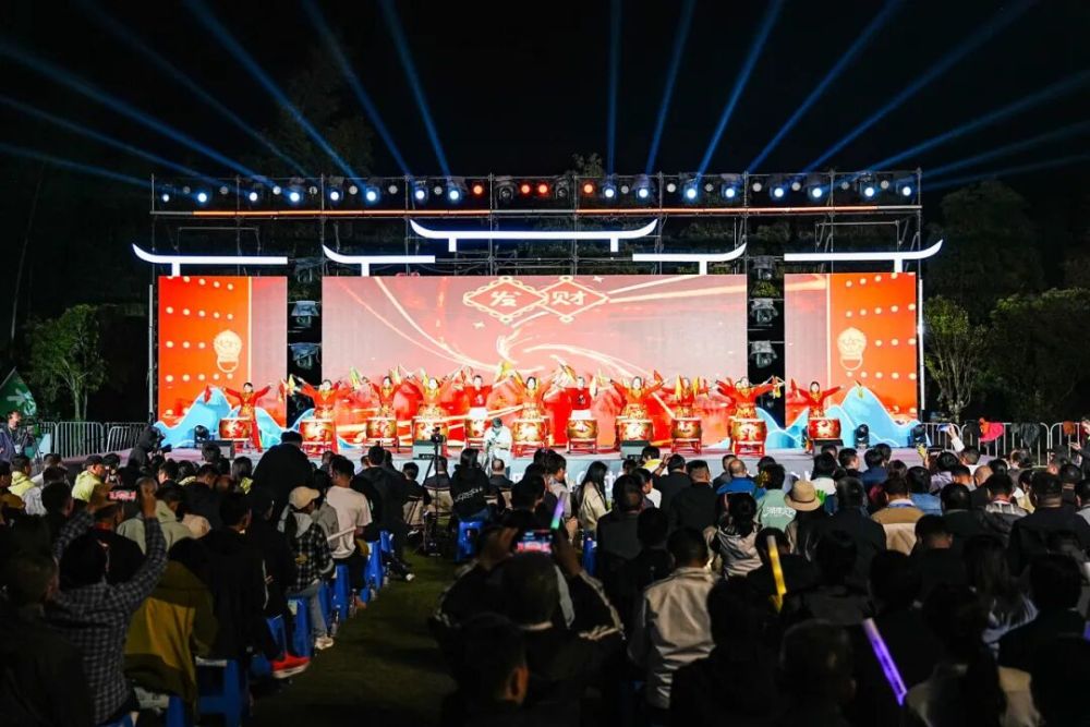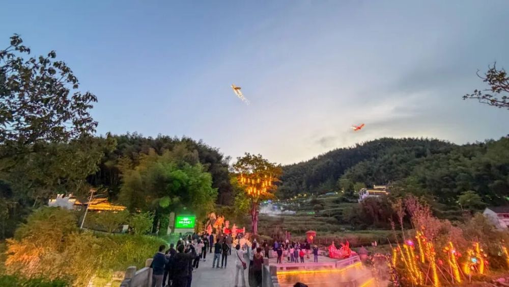 暮色四合,灵山古村流光溢彩。水口街灯次第亮起,梯田之上大地激光秀以丘陵为幕,将二十四节气农耕智慧投射于万顷山野;飞马飞凤悬空翩跹,灯影游龙穿行古巷,汉服舞者在天尊阁下长袖善舞……