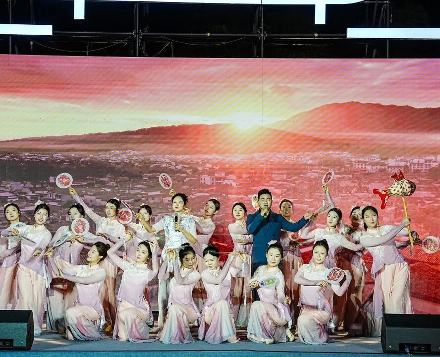 村晚舞台上,好戏连台。气势恢宏的《鼓震徽州》拉开序幕,灵山村选送的黄梅小戏《邂逅“乡”遇》以婉转唱腔诉说徽州乡间温柔相识,古村烟火与人间温情交织成诗。一个个接地气、有灵气的节目,赢得现场掌声阵阵,让和美乡村之美在新时代舞台绽放。